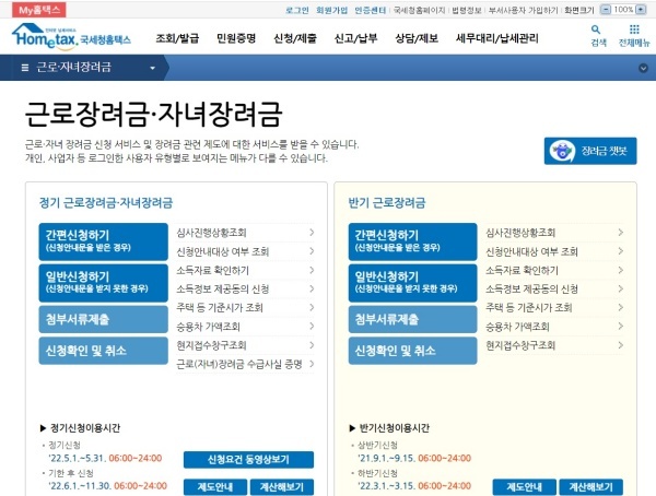 - www.hometax.go.kr 접속 → 신청/제출 → '근로·자녀장려금' → 근로장려금(정기/반기) 신청 → 개별인증번호, 주민등록번호 뒤 7자리 입력 → 신청완료