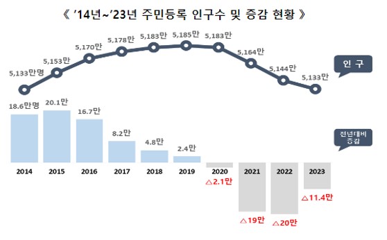 우리나라 주민등록 인구는 2023년 말 기준 5132만 5329명으로, 1년 전(5143만 9038명)보다 약 11만 명(0.22%) 감소해 2020년부터 4년 연속 감소세입니다. 2023년 출생(등록) 23만 5039명, 사망(말소) 35만 3920명으로 2022년 대비 각각 1만 9589명(▲7.69%)과 1만 8711명(▲5.02%) 감소했습니다. 이에 따라 자연적 요인(출생-사망)에 따른 주민등록인구 감소는 11만 8881명으로 2022년 10만 명(11만 8003명)을 넘어선 뒤 이 수준을 유지하고 있습니다.